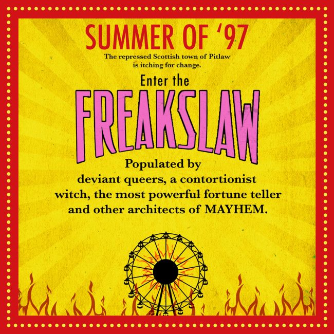 Enter the Freakslaw – a travelling funfair populated by deviant queers, a contortionist witch, the most powerful fortune teller, and other architects of mayhem. It doesn’t take long for the Freakslaw folk to infiltrate Pitlaw’s grey world, where the town’s teenagers – none more so than Ruth and Derek – are seduced by neon charms and the possibility of escape. But beneath it all, these newcomers are harbouring a darker desire: revenge. And as tensions reach fever pitch between the stoic locals and the dazzling intruders, a violence that’s been simmering for centuries is about to be unleashed…